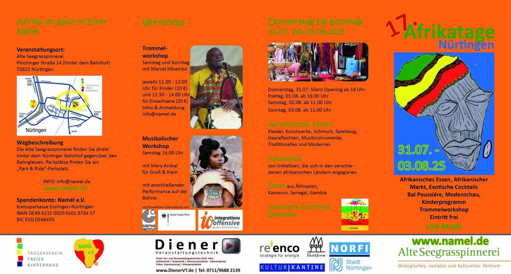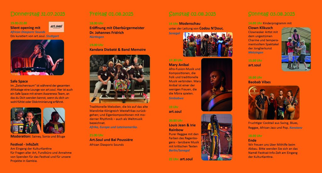 Am Eingang der KulturKantine für Fragen aller Art, Fundbüro und Annahme von Spenden für das Festival und die Projekte in Gambia. Sedat Jobe und Kalifa Susso von Namél Foundation Gambia informieren Sie gerne persönlich am Nachmittag.